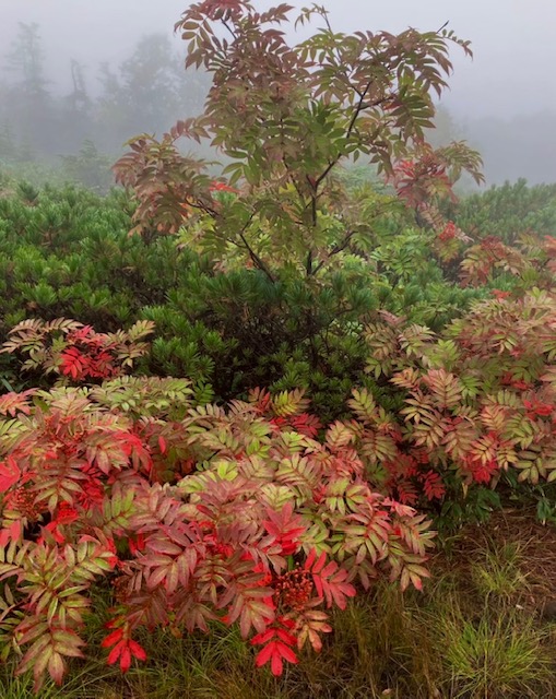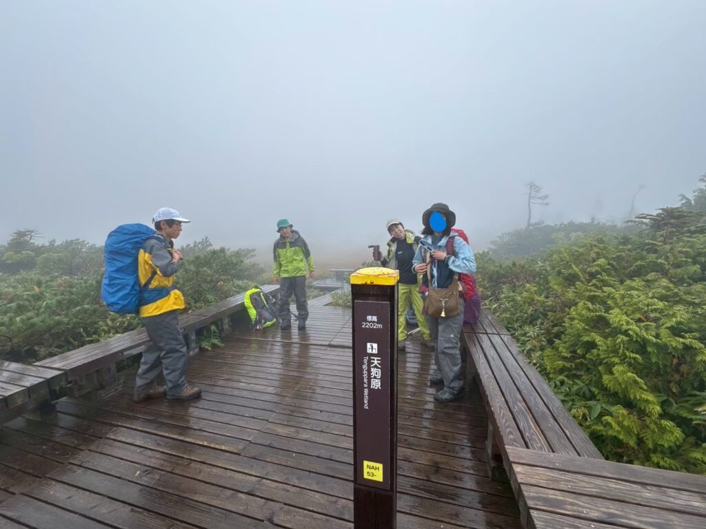 栂池自然園到着、すでに標高は高く雨模様。雨合羽を装着。