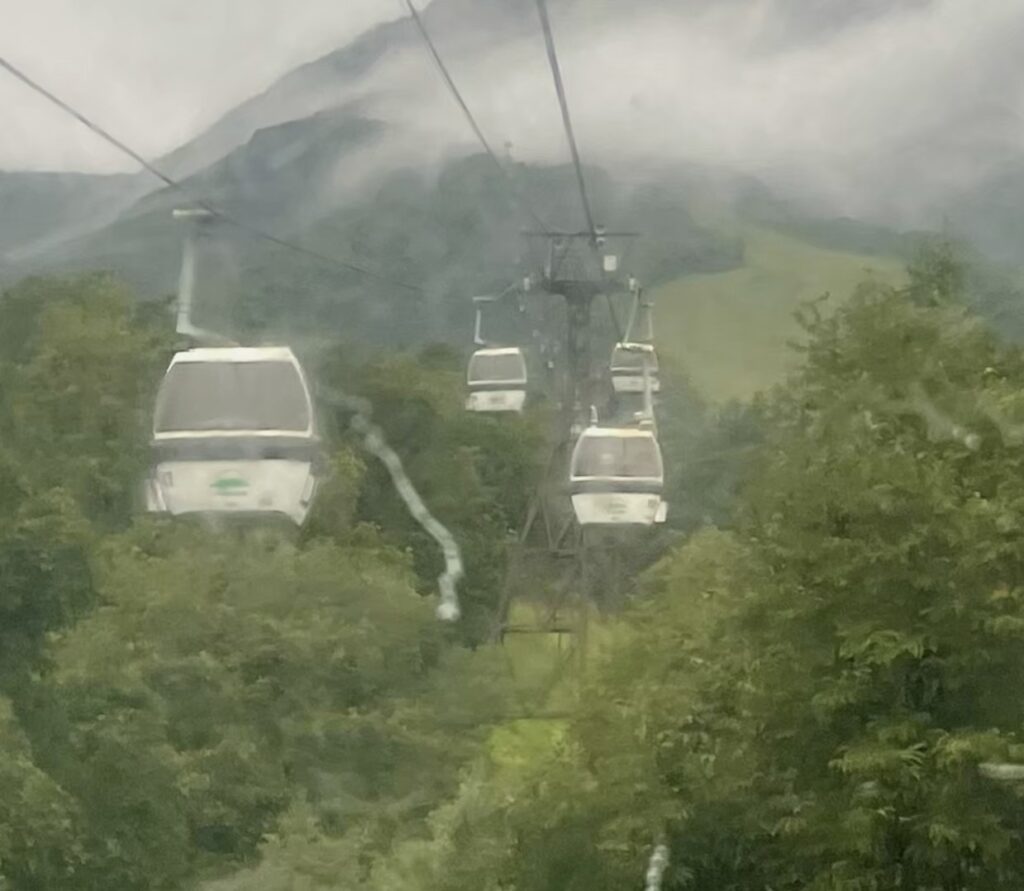 ゴンドラとリフトを乗り継いで栂池自然公園へ上がっていく。ガスっている、視界悪し