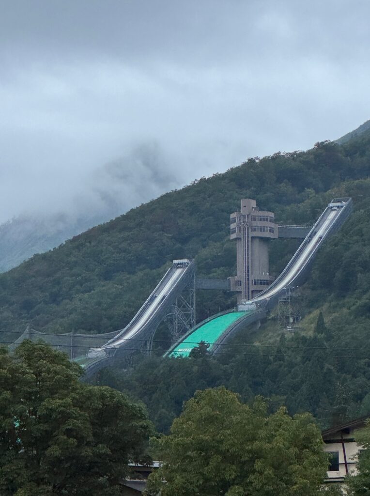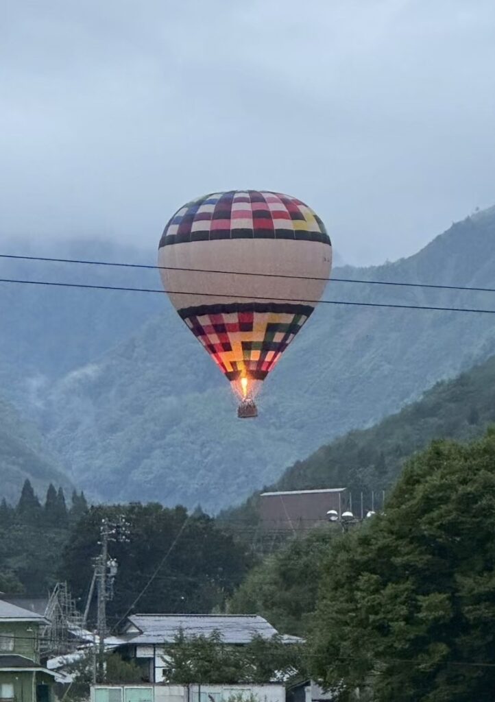 起床して窓のカーテンを開けるとスキージャンプ台と気球が見える。