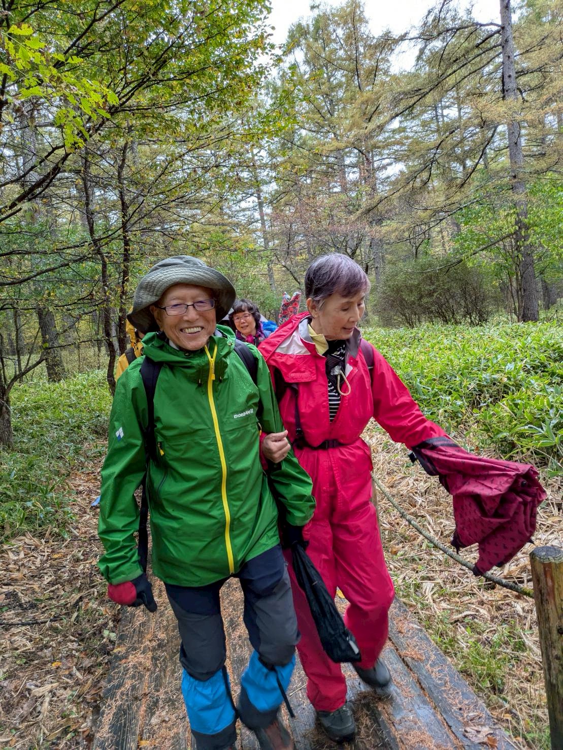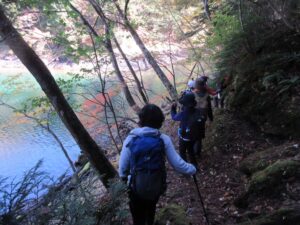 17日(金)晴天!宿を8時に出発。雨上がりの登山道、小峠、石段を経て刈込湖まで慎重に上る。紅葉を映した湖面は静まりかえっている。集合写真を撮り、小休止して切込湖に向かう。やや下りであるが大きな石がごろごろしている。切込湖、涸沼を通過。最大の難所1730mの山王峠に登る。12時30分見晴らしの丘に到着。ここでランチタイム。先頭を行くガラチャンが「ここからは幸徳牧場までは下りです!」の声でいくらか元気がでて出発。やや歩きやすいため間隔ができる。先頭を行くガラチャンが終点10分前のところで右足首を挫いて応急処置をする。全員15時03分のバスに乗り込み、東武日光駅に向かい解散となった。