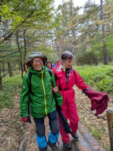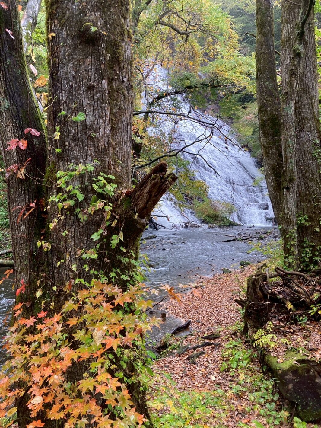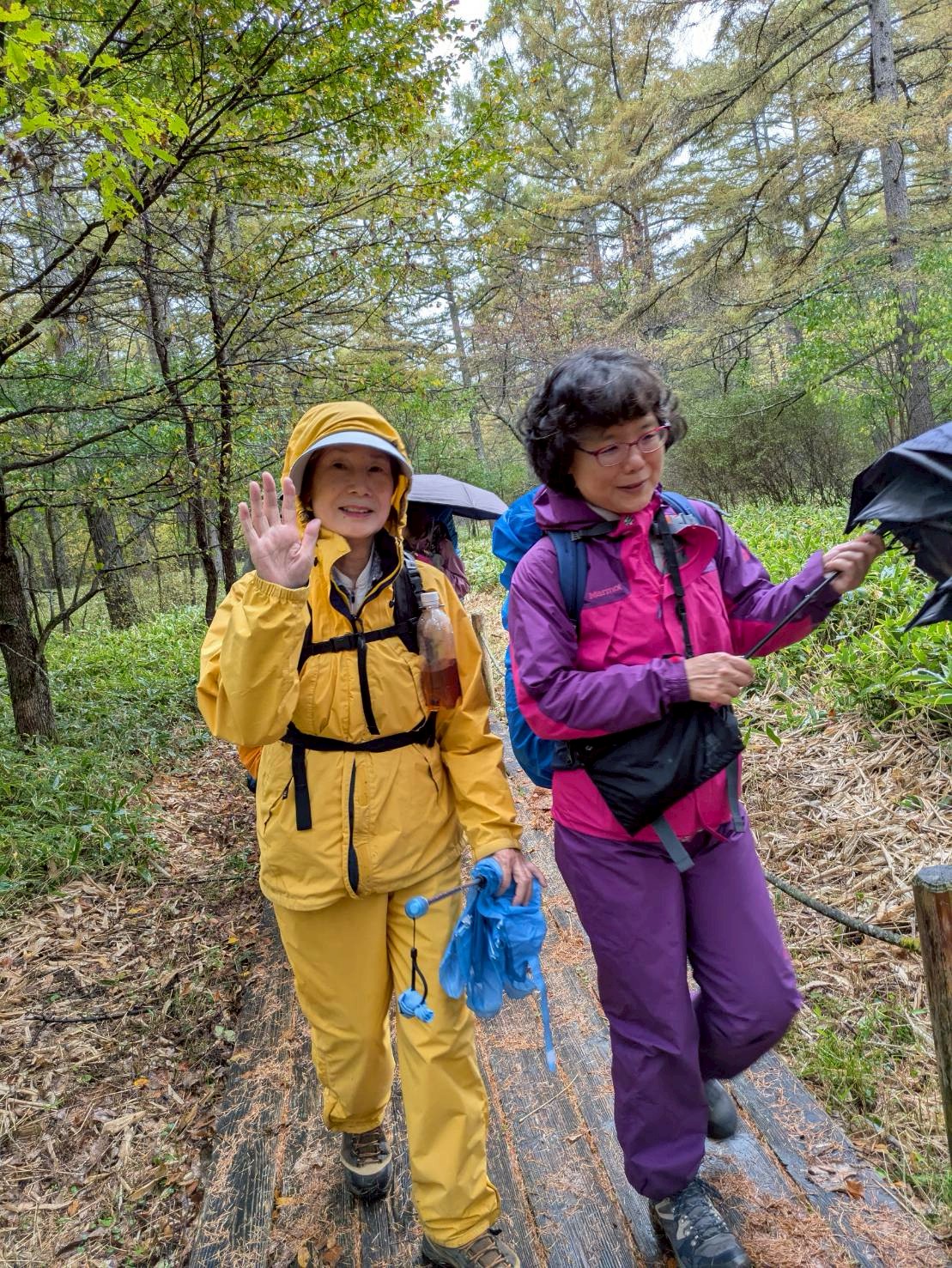 16日(木) 9時39分東武日光駅着。中善寺湖の上の赤沼に雨の中下りる。各々レインウエアを装着した後少々早いが昼食をとる。12時小雨の中戦場ヶ原に向かう。紅葉のなか、青木橋、泉門池(いずみやどいけ)を経て、壮大な湯滝を眺めた後、湯滝よりバスで湯元温泉に到着。