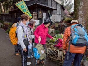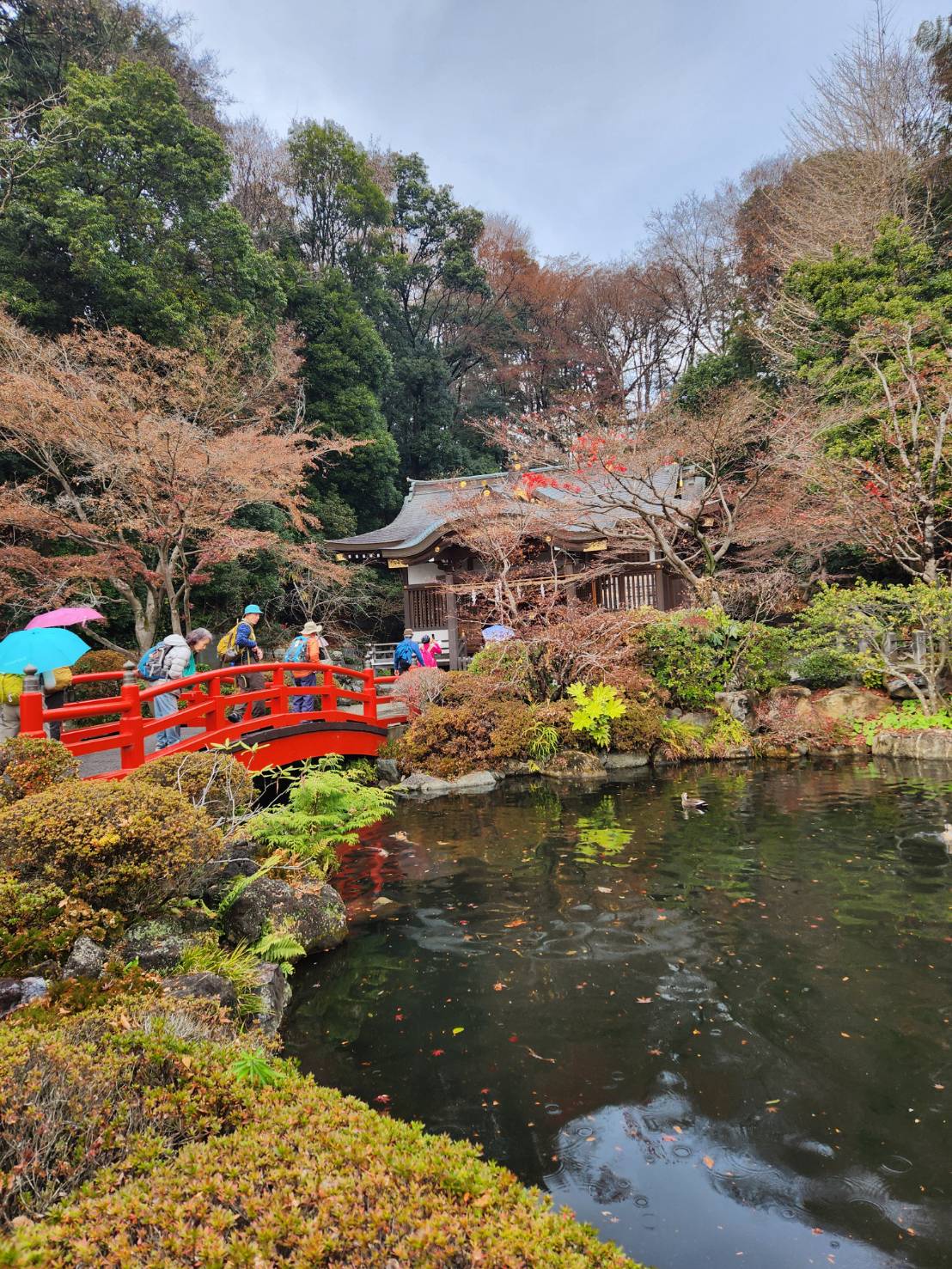 8人ずつの小グループに分かれて西国分寺駅を出発した。国分寺公園で最初の休憩をした。小雨になり傘を差した。紅葉のきれいな遊歩道を通り坂道を下ると「おたかの道湧水園」に着いた。紅葉がきれいだった。湧き水の出方は少ない感じがした。雨はやみ青空が見えてきた。資料館見学組とカフェ組に分かれて休憩した。細い遊歩道を抜けると車道に出た。崖線下の住宅地を下流へと歩いた。東経の森では池の落ち葉がきれいだった。野川に出るとカルガモが泳いでいた。すぐに貫井(ぬくい)神社に着いた。池には大きな鯉が泳ぎ、カルガモも浮かんでた。本堂横の湧水にAさんが手を触れ、「温い(ぬくい)」との感想を言った。野川の河原に出てしばらく進むと、獲物を狙うアオサギとコサギがいた。橋の高さが低く、腰をかがめて通過しなければならなかった。トンネルになった野川を学校横の旧河川で迂回した。再び野川に出ると土手の黄葉が花のようにきれいだった。武蔵野公園では公園中央の「くじら山(53m)」に登り集合写真を撮った。広場に出て昼食休憩にした。落ち葉の公園は昼食にはもってこいだった。昼食後は次の野川公園まで進み、自然観察園で紅葉を楽しみながら一周した。落ち葉の赤がきれいだった。家族連れが一組いるだけで静かだった。一周後は自然観察センター前に行き解散した。この日は怪我無く歩く事ができて一年のしめくくりができた。紅葉もきれいで満足したハイキングだった。