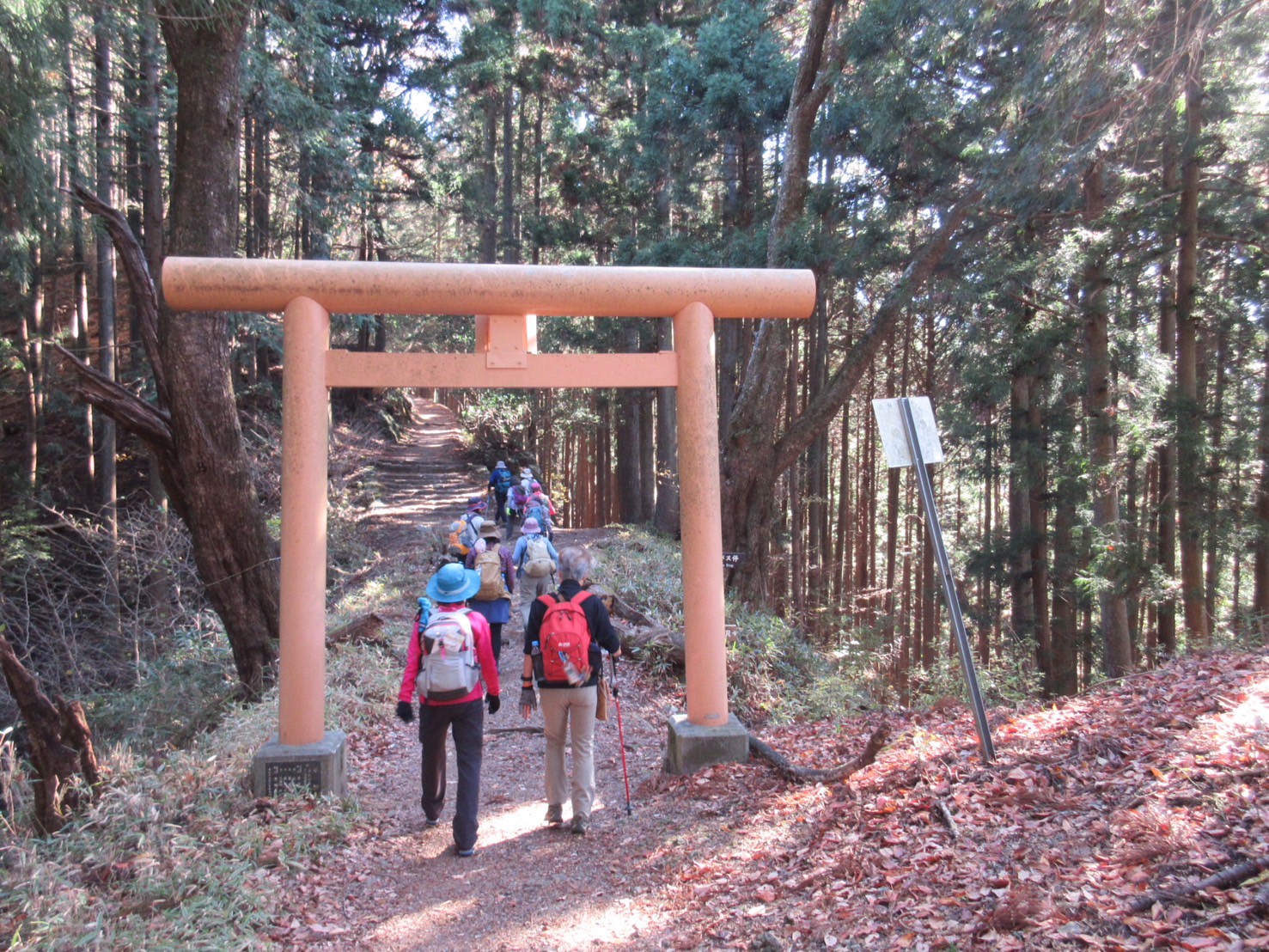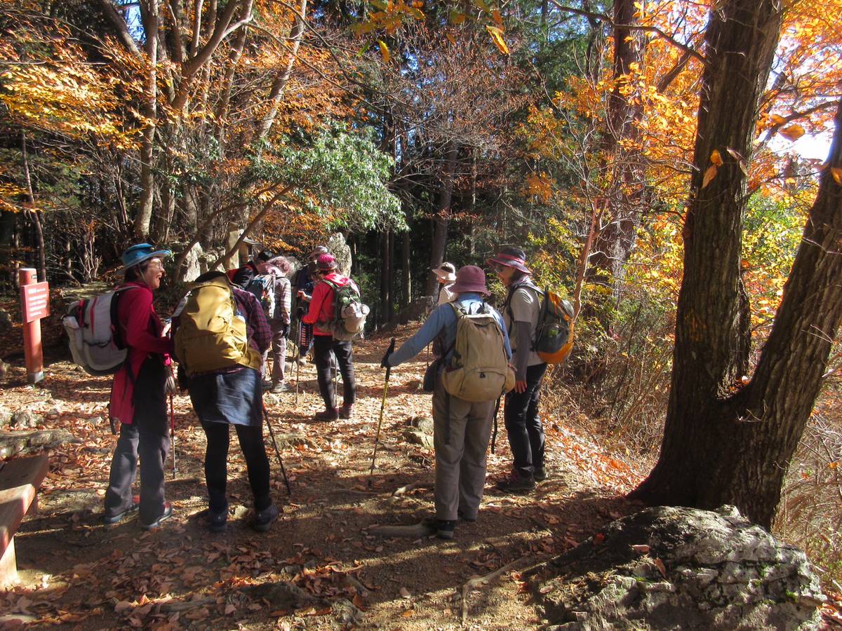 多くの宿坊の中をすぎると、樹林帯です。所々に綺麗な紅葉を見ながらの登山です。頂上近くになると、きつくなり、休みを取り、再出発する。前方が明るくなり、急な階段を登ると、日の出山の頂上である。雲一つない青空、東京方面は靄っているが、大山から丹沢山麓、富士山も顔をだしてくれた。11時30分着、昼食としました。