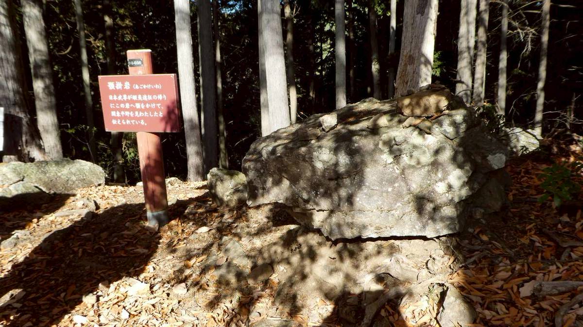 日本武尊が顎を岩にかけ、関東平野を見たという伝説です。当時は木が無かったから、見えたのでしょう。