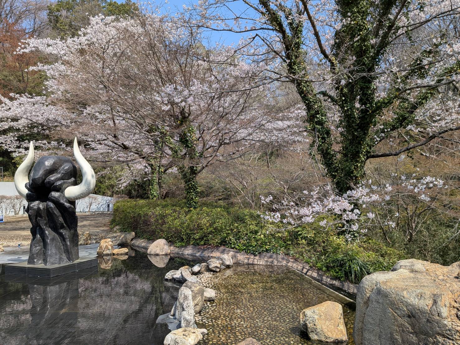 向ヶ丘遊園駅から、町中を抜け、生田緑地東口に着くと、青空の中、満開の桜が咲いていた。今日はハイキング日和の様だ。初めは、山道の階段を登り、日本民家園を左に見て、枡形山に着いた。広い広場で、ここが城趾であろうか?展望台に上がると、眼下に桜が満開、遠くには、東京都や多摩川、360°のパノラマである。展望台を降り、集合写真を撮り、桜を見ながら行くと、岡本太郎美術館があり、高い芸術の塔があった。その先、高いメタセコイアの木を見上げながら行くと、中央広場に着いた。家族、仲間など、シ―トを敷き、楽しんでいました。